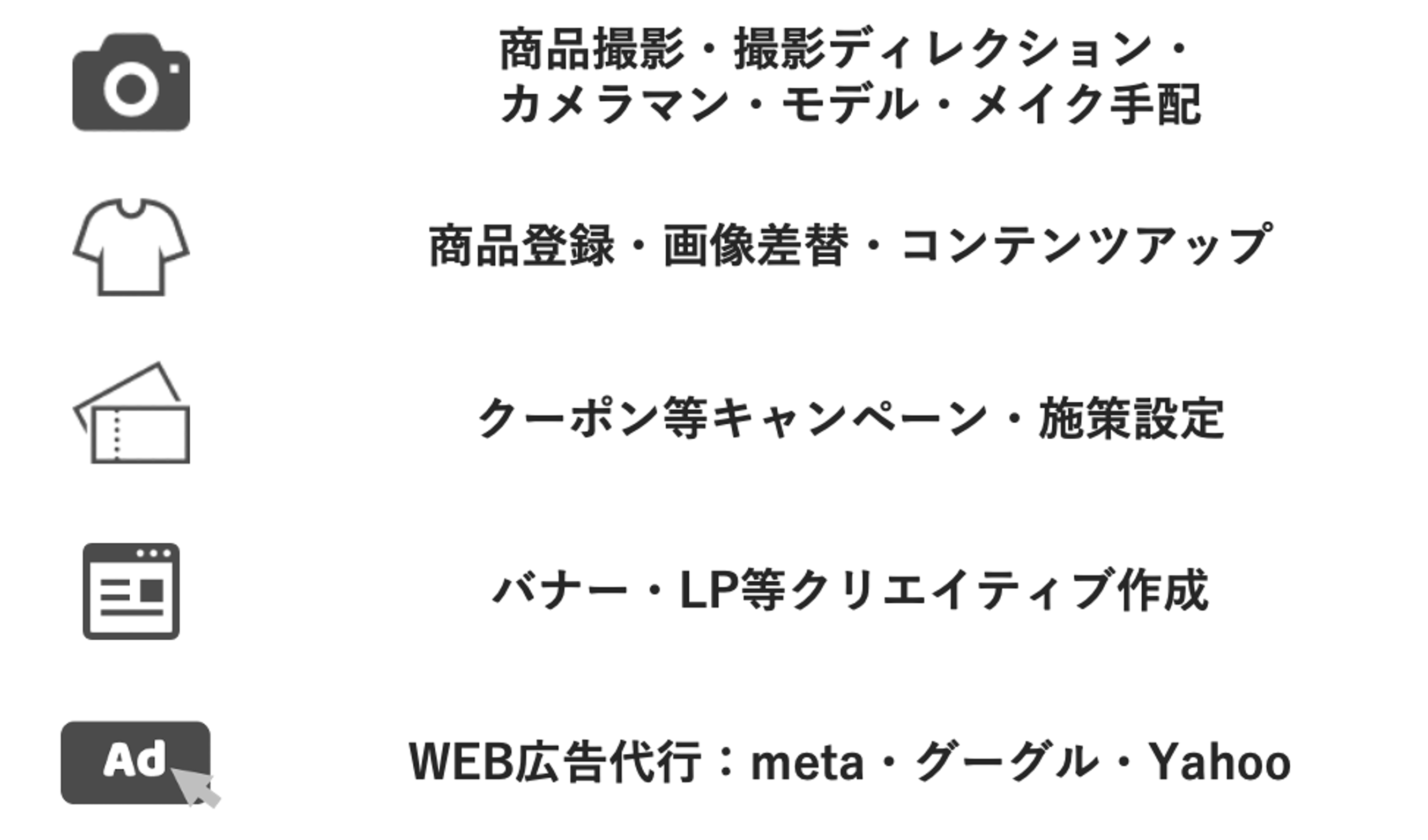 EC販売に欠かせない撮影業務からサイト運用に関わる商品登録・コンテンツアップ・施策の設定などを代行。